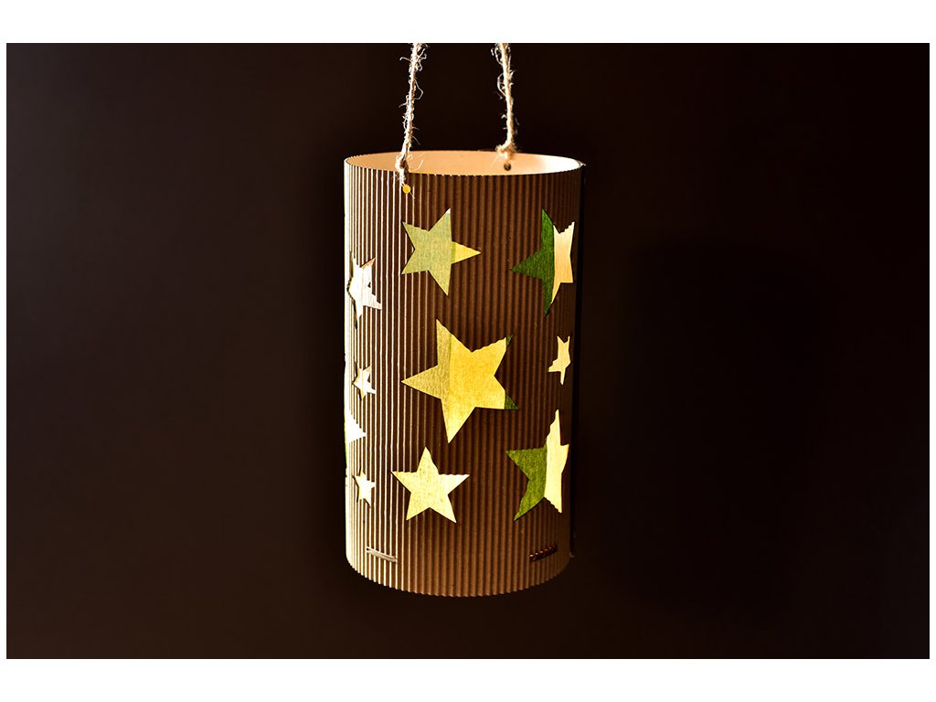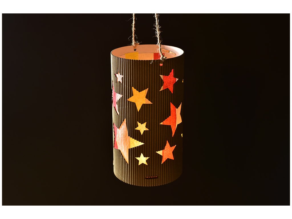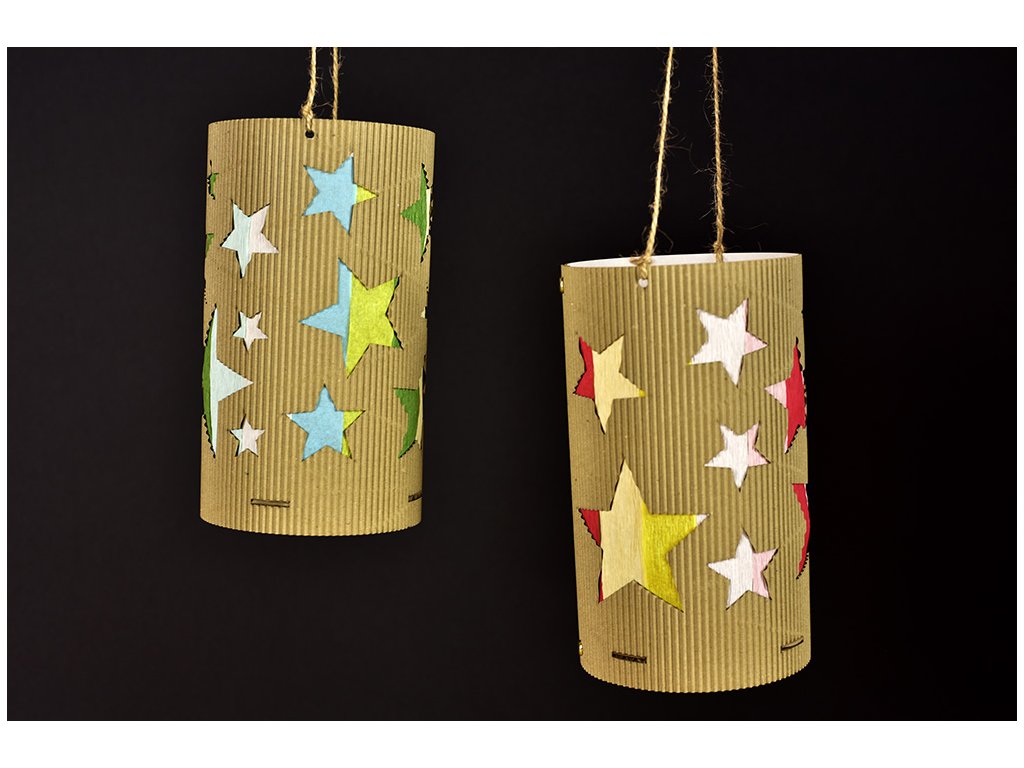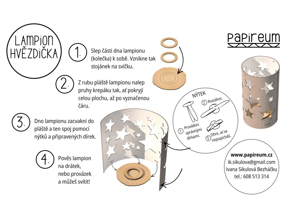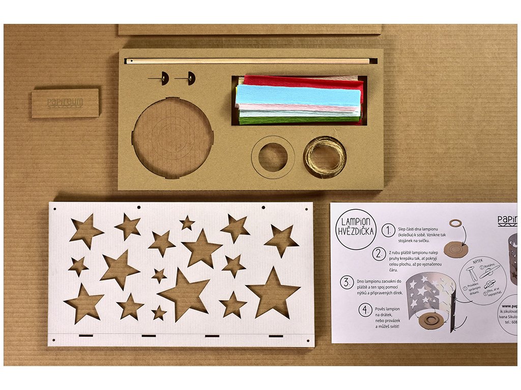 Sada obsahuje 2 lepenkové části lampionu, předchystané proužky barevného krepáku, kovové nýtky, provázek a tyčku na držení.
